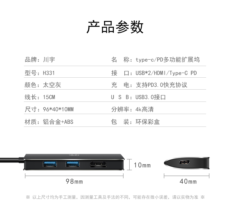川宇 Type-c转USB-C扩展坞 +HDMI接口+pd充电 H331